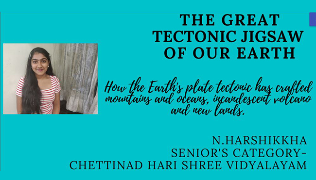 Harshikkha Narayanan of Grade XI won the first prize in the All-India Geo Genius Project Competition 2021 in the senior’s category. She made her entry under the title, ‘Earth’s tectonic plates have crafted mountains, oceans, incandescent volcanoes and new lands.’
