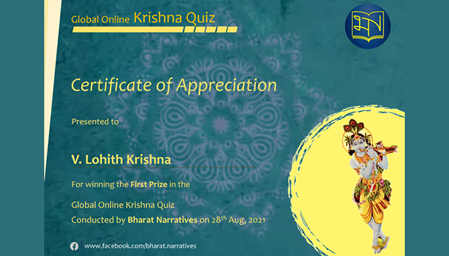 V Lohith Krishna of Grade 4 won the 1st Prize in the Global Online Krishna Quiz conducted by Bharath Narratives. He was one among 21 children between the ages 6 and 12, who participated from around the world.