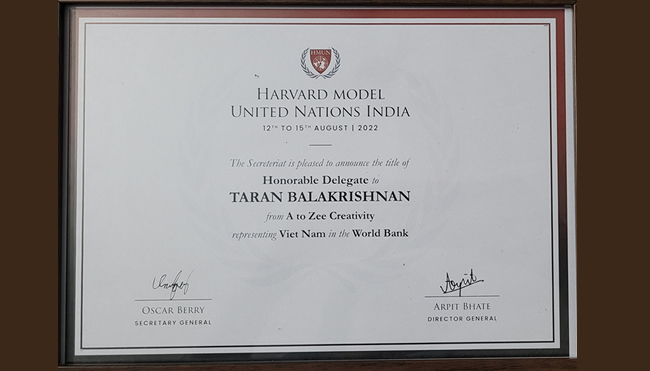 Taran Balakrishnan of grade X participated in Harvard Model United Nations held at Hyderabad. He bagged the Honorable Delegate Award, representing the World Bank.