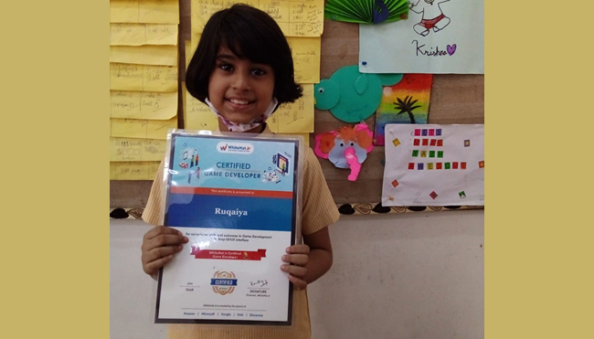 Ruqaiya A J of grade III has been certified as a young game developer by WhiteHat Jr for exceptional skills and outcomes in Game Development with deep UI/UX interface.