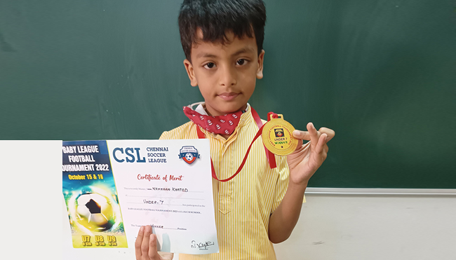 Nihhaan Khatod from Grade II participated in the Baby League Football tournament held at KCH School and his team won the championship.