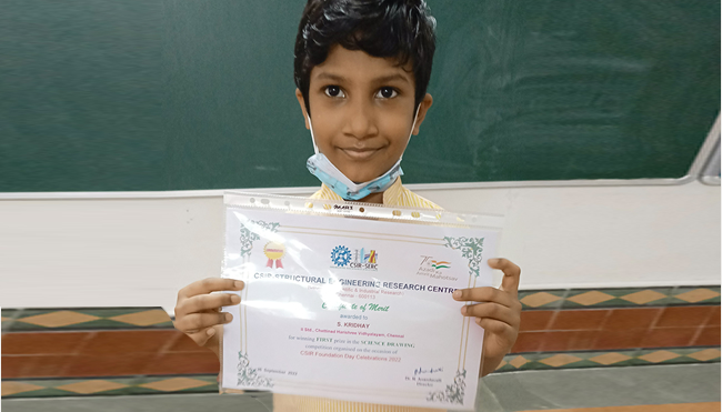 Kridhay.S of Grade II received 1st prize in Model making and Science drawing conducted by CSIR- SERC.
